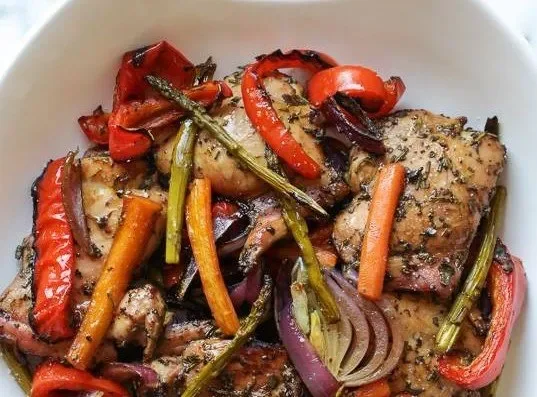 This Balsamic Chicken with Roasted Vegetables is a quick, one-pan meal perfect for busy weeknights. Tender chicken thighs and colorful vegetables roast together with a savory balsamic-herb glaze for a flavorful dinner ready in just 30 minutes.