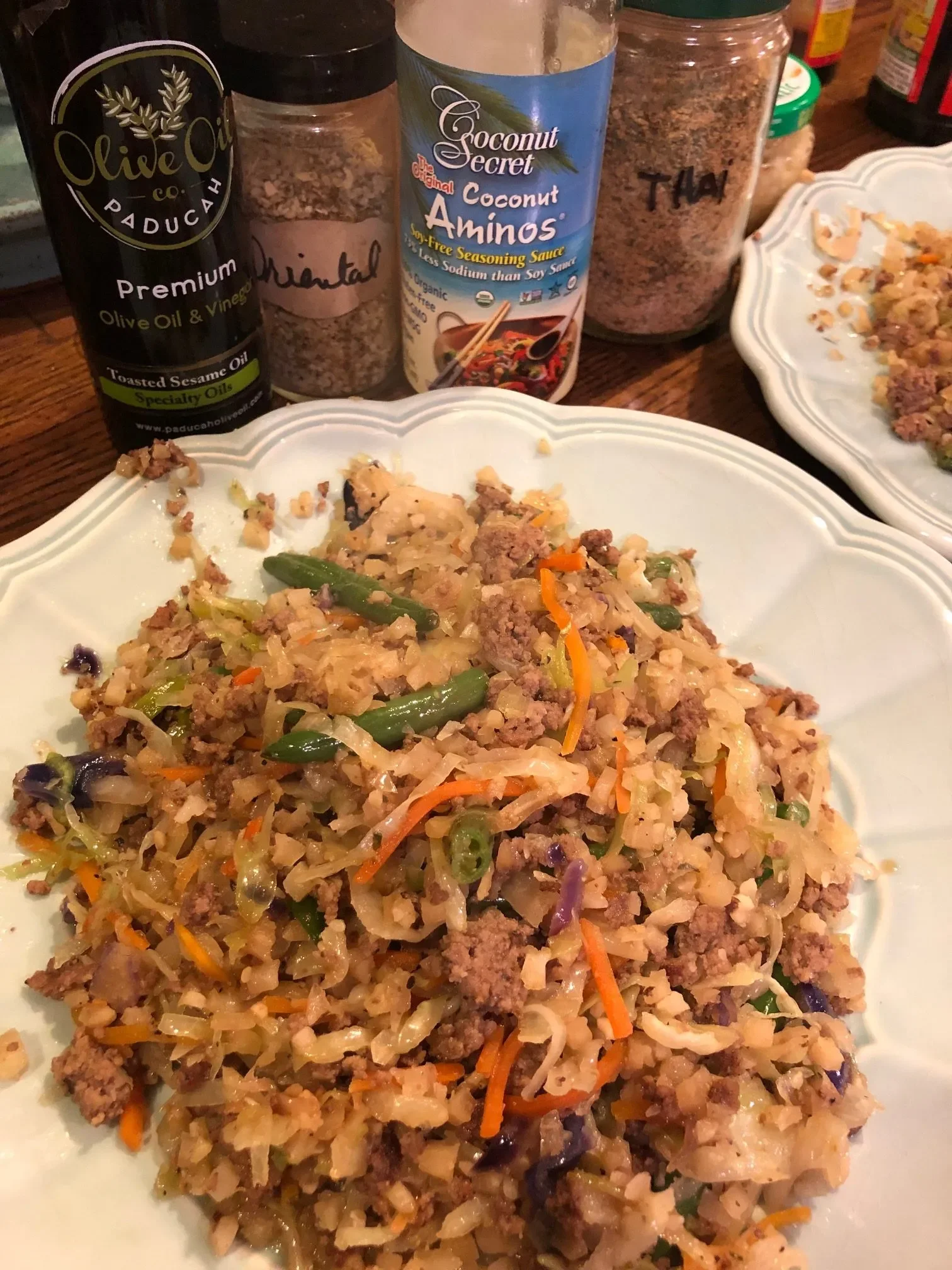 Add the riced cauliflower and coconut aminos, stirring to combine and heat through.