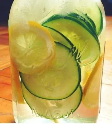 In a 1-liter mason jar or container, add sliced cucumber and lemon.