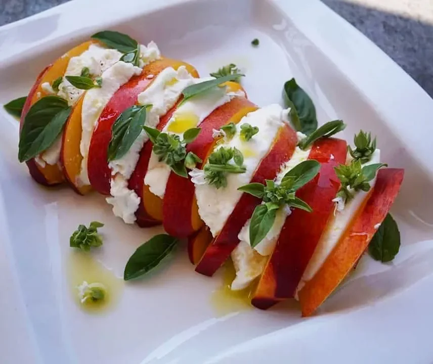 A sweet, summery twist on the classic Caprese salad — creamy ricotta, juicy peaches, fragrant basil, and a drizzle of white peach balsamic with wild dill olive oil. Perfect as a light starter, side dish, or even brunch option.