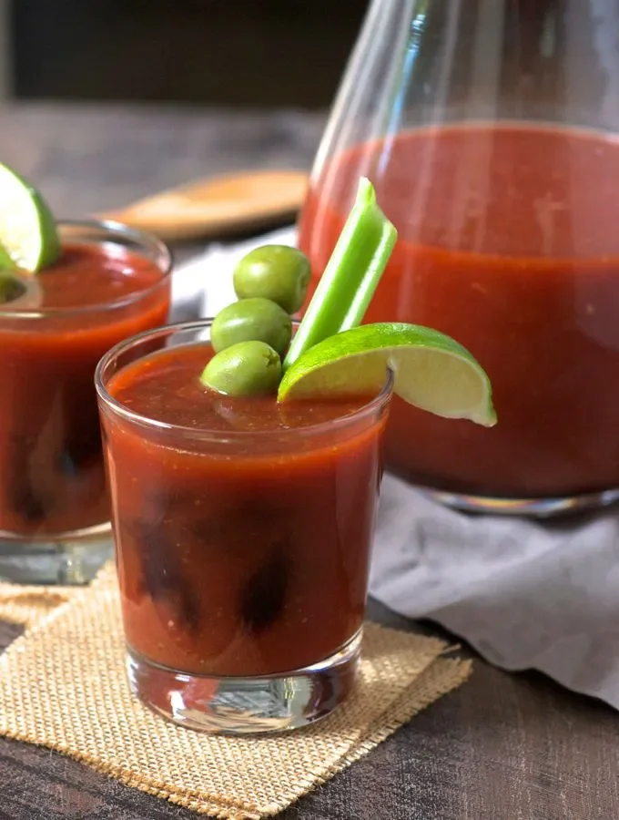 Pulse chopped celery in a food processor until coarsely ground. Add about 1 cup of the tomato mixture and puree until smooth. Stir this back into the pitcher with the rest of the mix.Assemble the drinks: